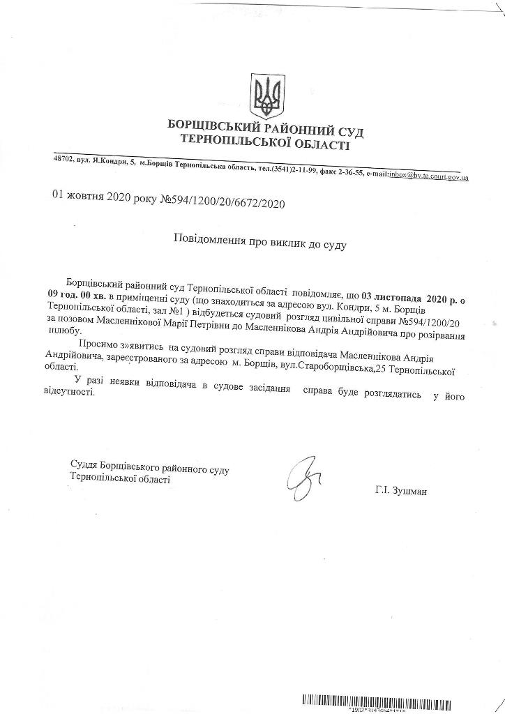 Повідомлення про виклик до суду Масленнікова Андрія Андрійовича