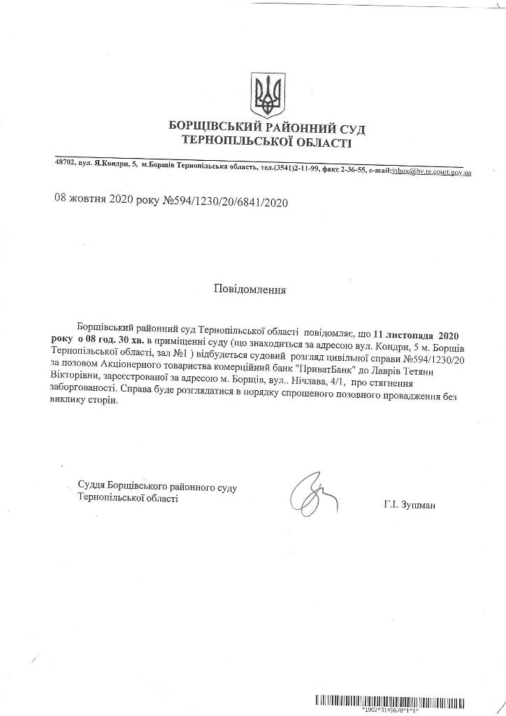 Повідомлення про виклик до суду Лаврів Тетяни Вікторівни