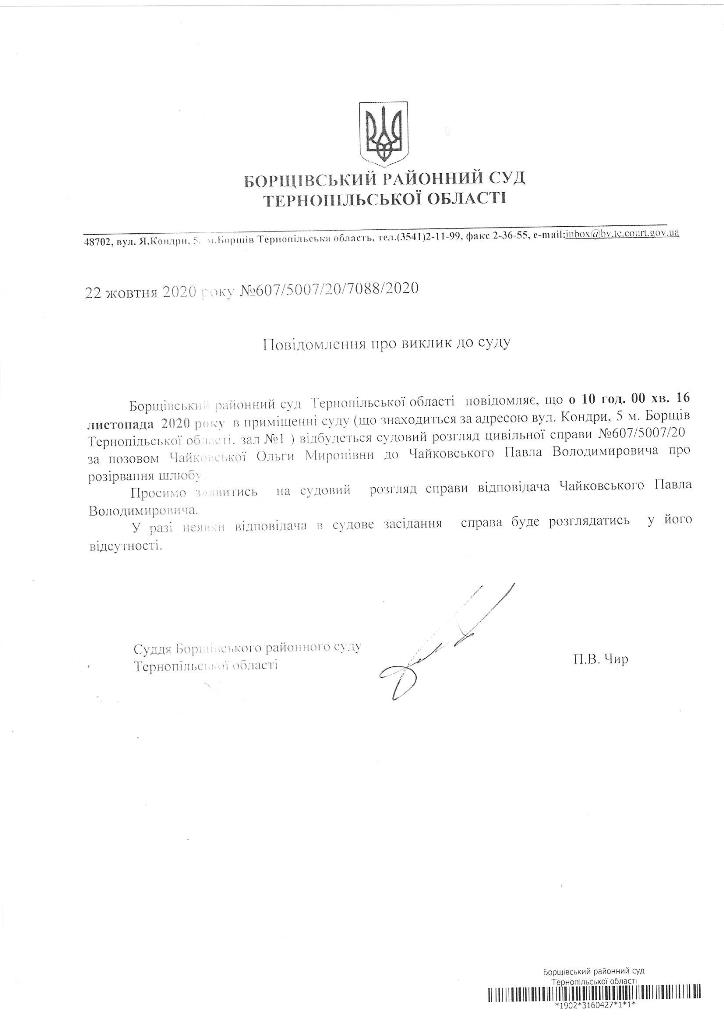 Повідомлення про виклик до суду Чайковського Павла Володимировича