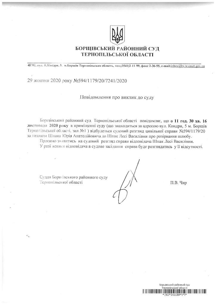Повідомлення про виклик до суду Шпак Лесі Василівни