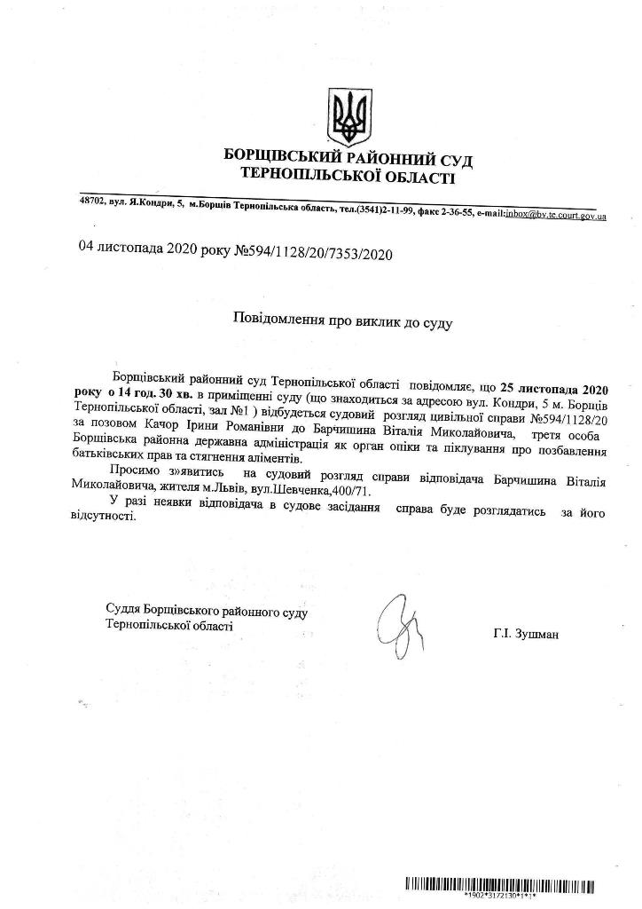 Повідомлення про виклик до суду Барчишина Віталія Миколайовича