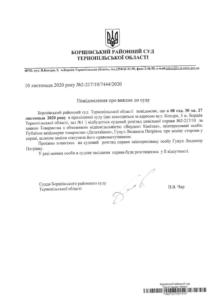 Повідомлення про виклик до суду Гуцул Людмилу Петрівну