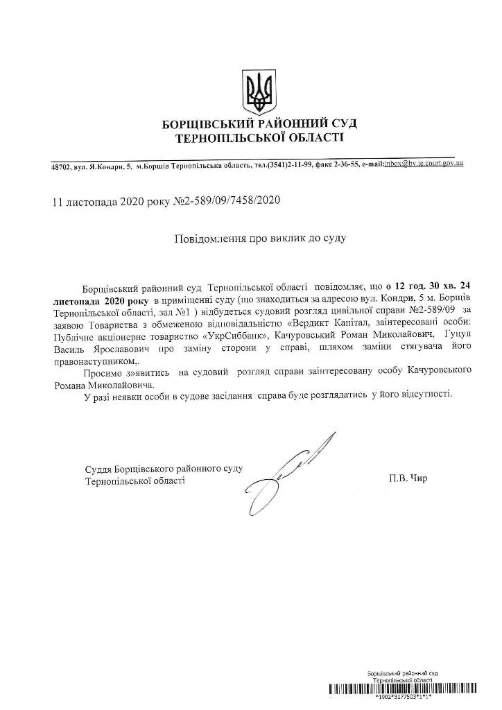 Повідомлення про виклик до суду Качуровського Романа Михайловича