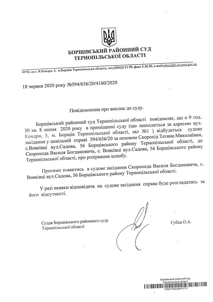 Повідомлення про виклик до суду Скорохода Василя Богдановича