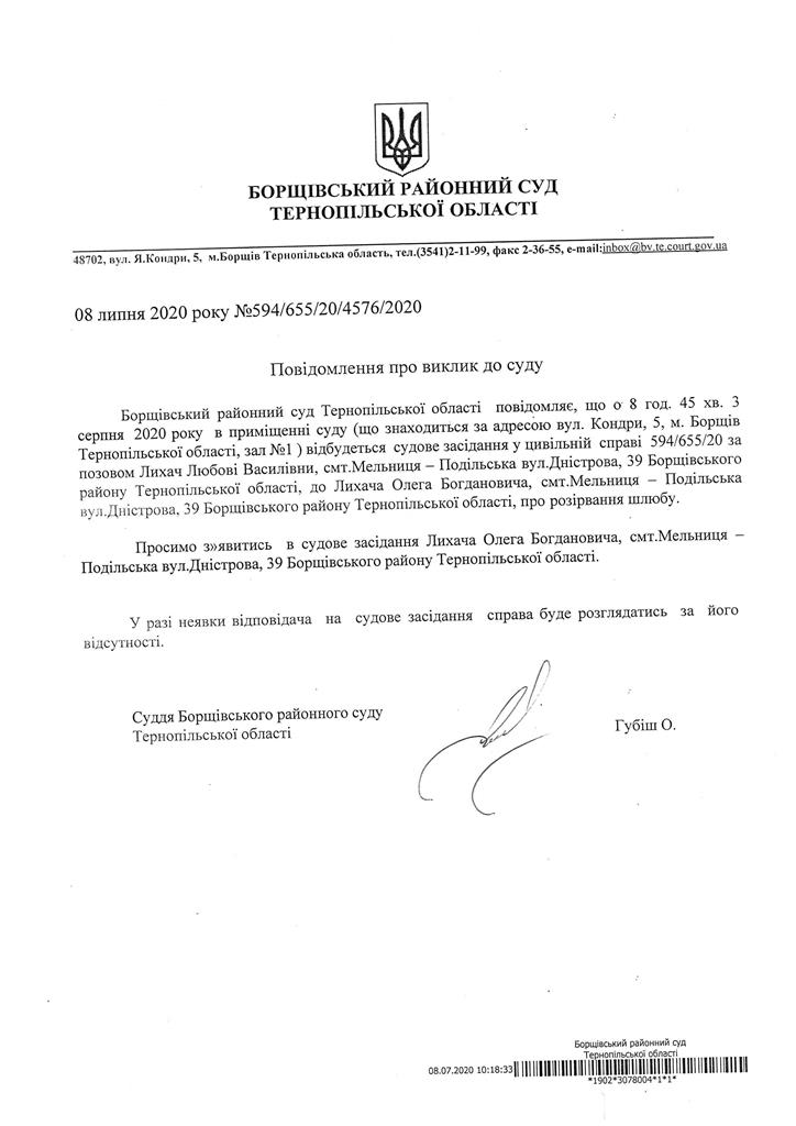 Повідомлення про виклик до суду Лихача Олега Богдановича