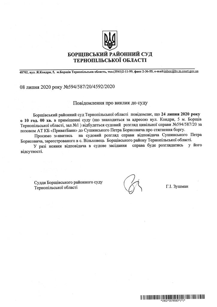 Повідомлення про виклик до суду Сушинського Петра Борисовича