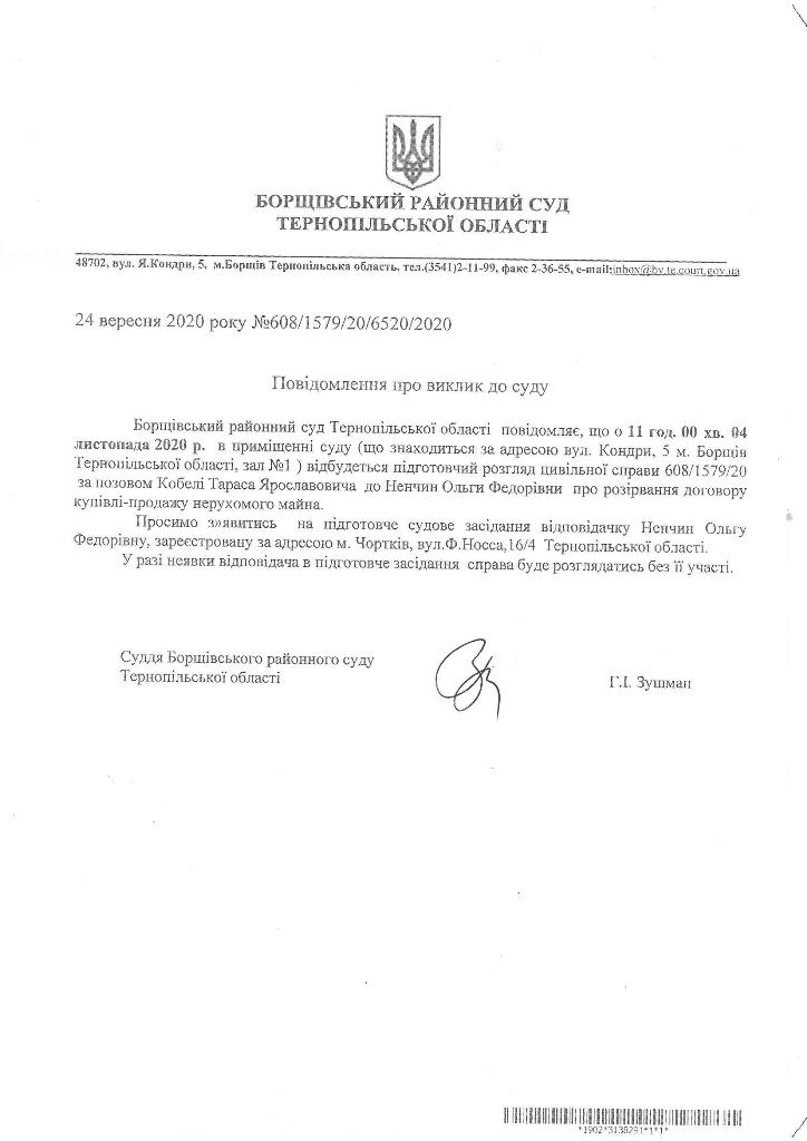 Повідомлення про виклик до суду Ненчин Ольгу Федорівну