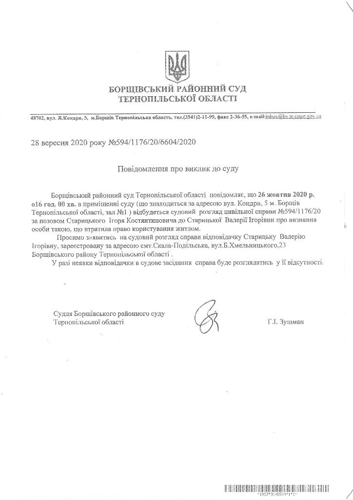 Повідомлення про виклик до суду Старицьку Валерію Ігорівну