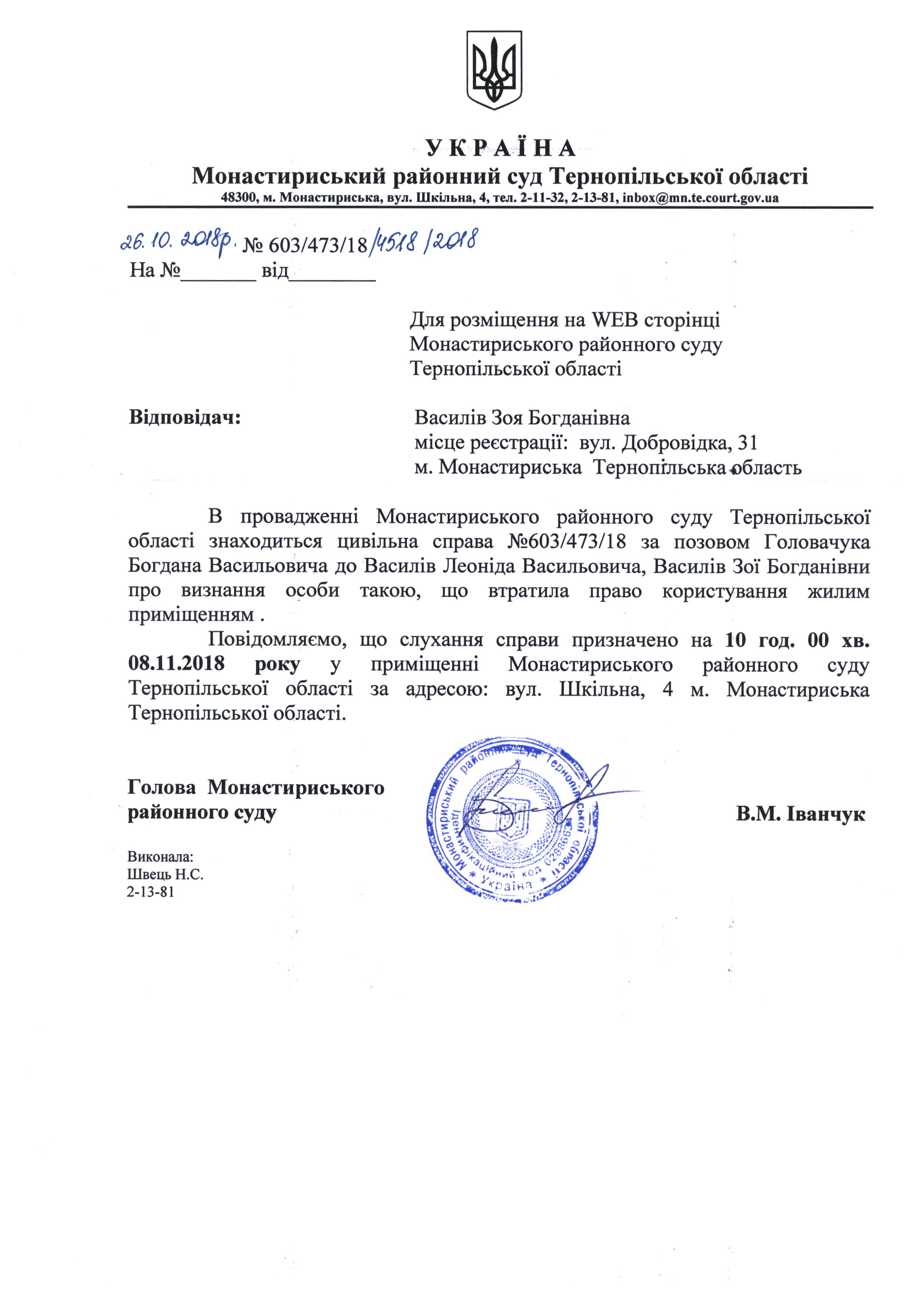 Оголошення про виклик до суду Василів Зої Богданівни для розгляду справи на 10 год. 00 хв. 08.11.2018 року