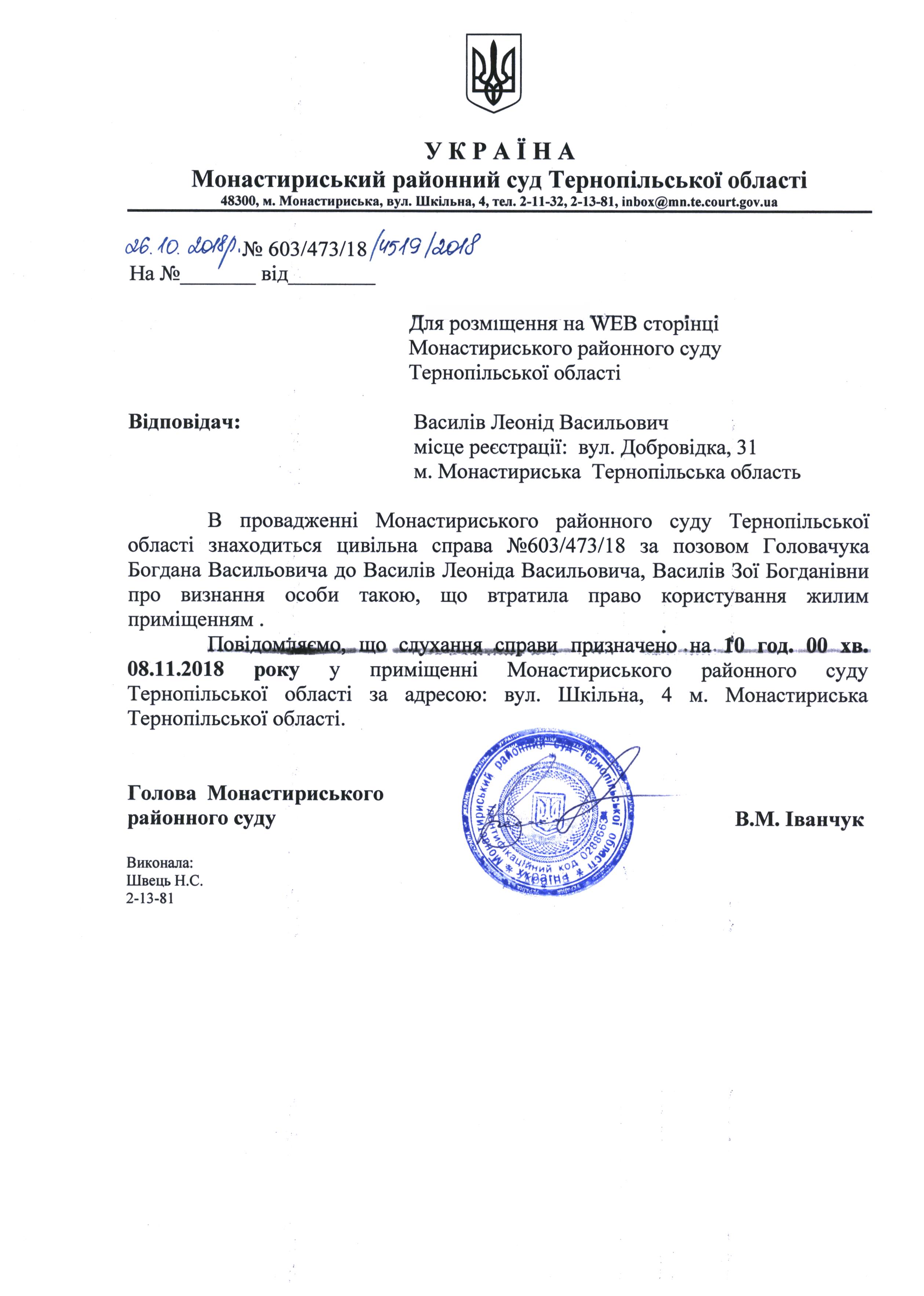 Оголошення про виклик до суду Василів Леоніда Васильовича для розгляду справи на 10 год. 00 хв. 08.11.2018 року