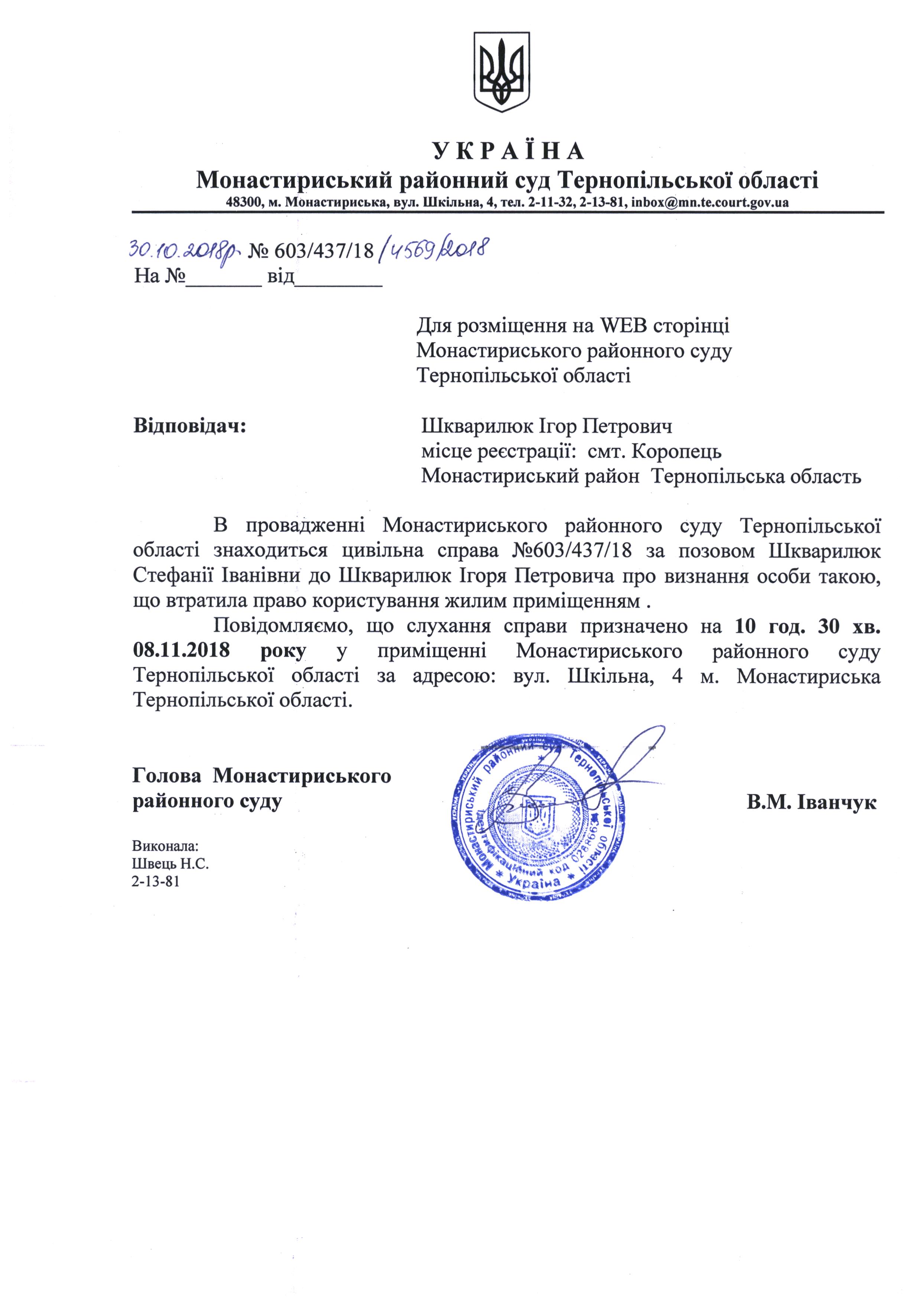 Оголошення про виклик до суду Шкварилюк Ігоря Петровича для розгляду справи на 10 год. 30 хв. 08.11.2018 року
