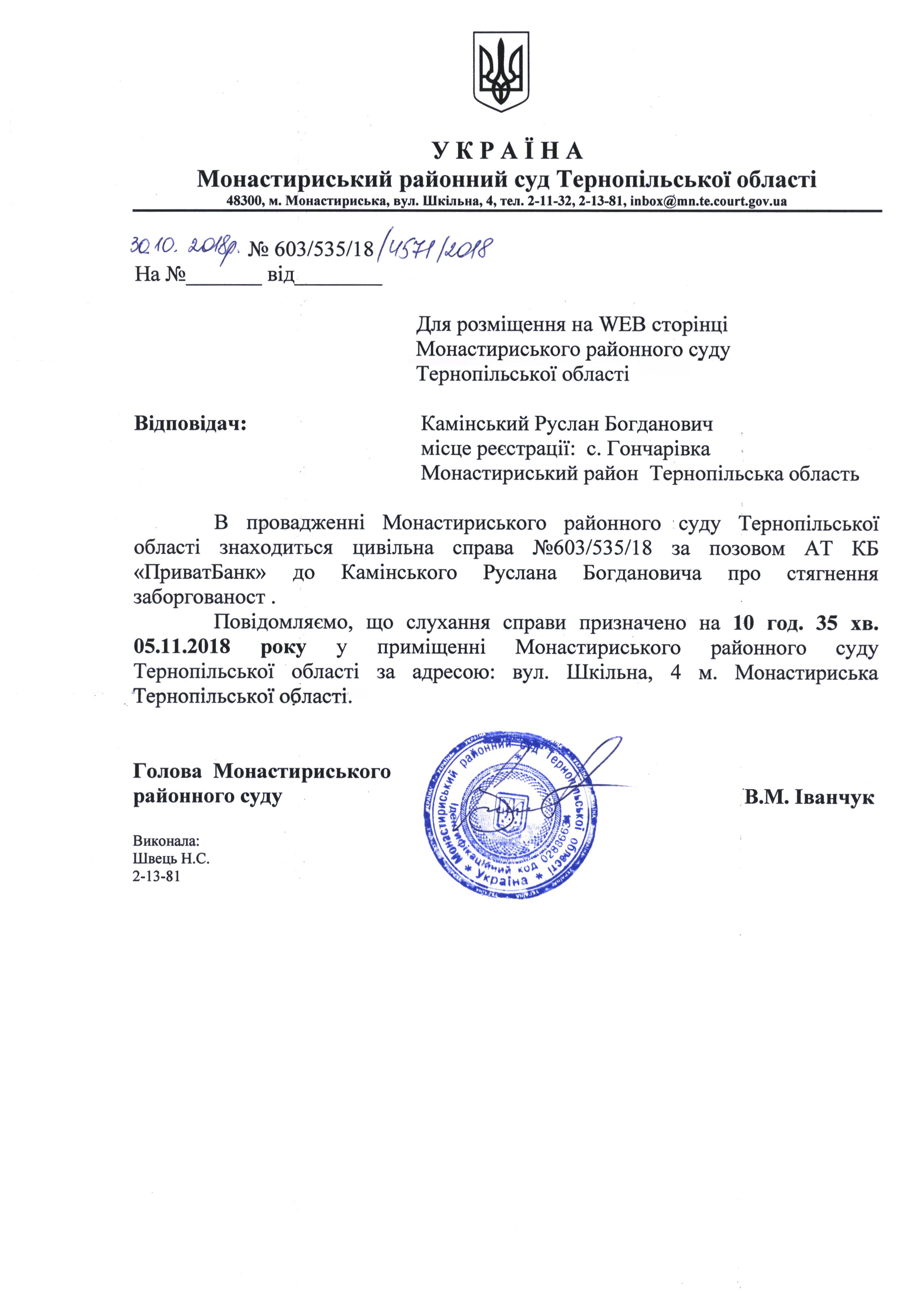 Оголошення про виклик до суду Камінського Руслана Богдановича для розгляду справи на 10 год. 35 хв. 05.11.2018 року