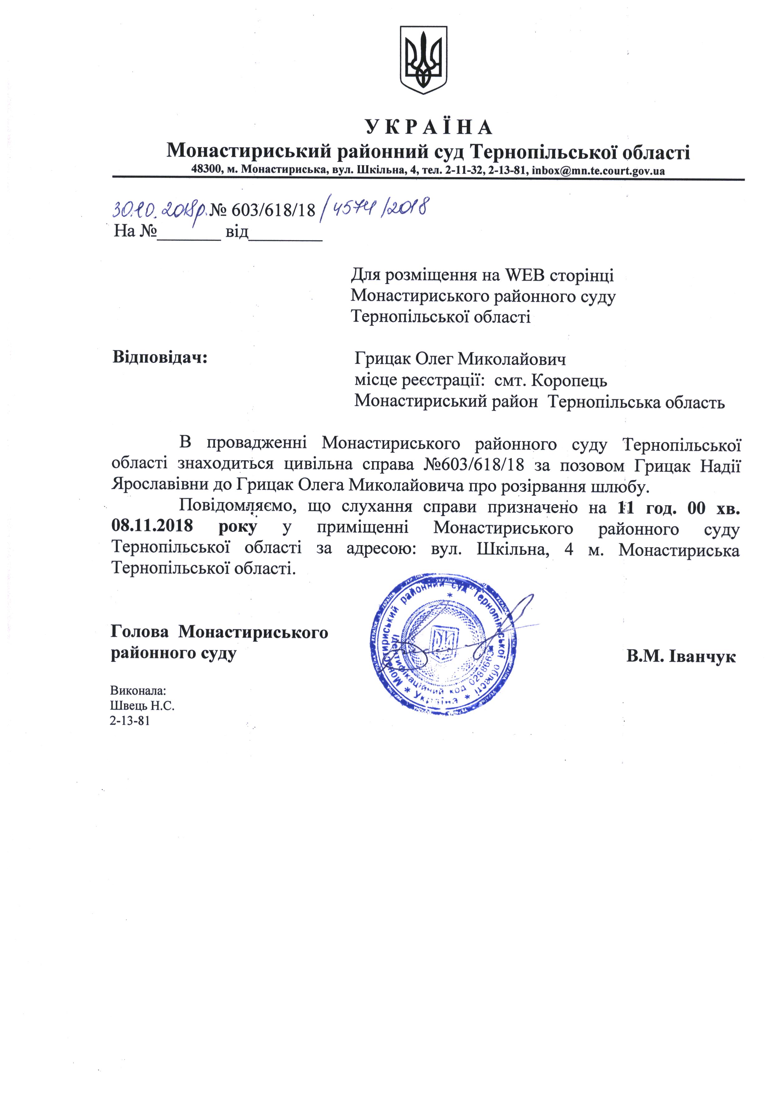 Оголошення про виклик до суду Грицак Олега Миколайовича для розгляду справи на 11 год. 00 хв. 08.11.2018 року