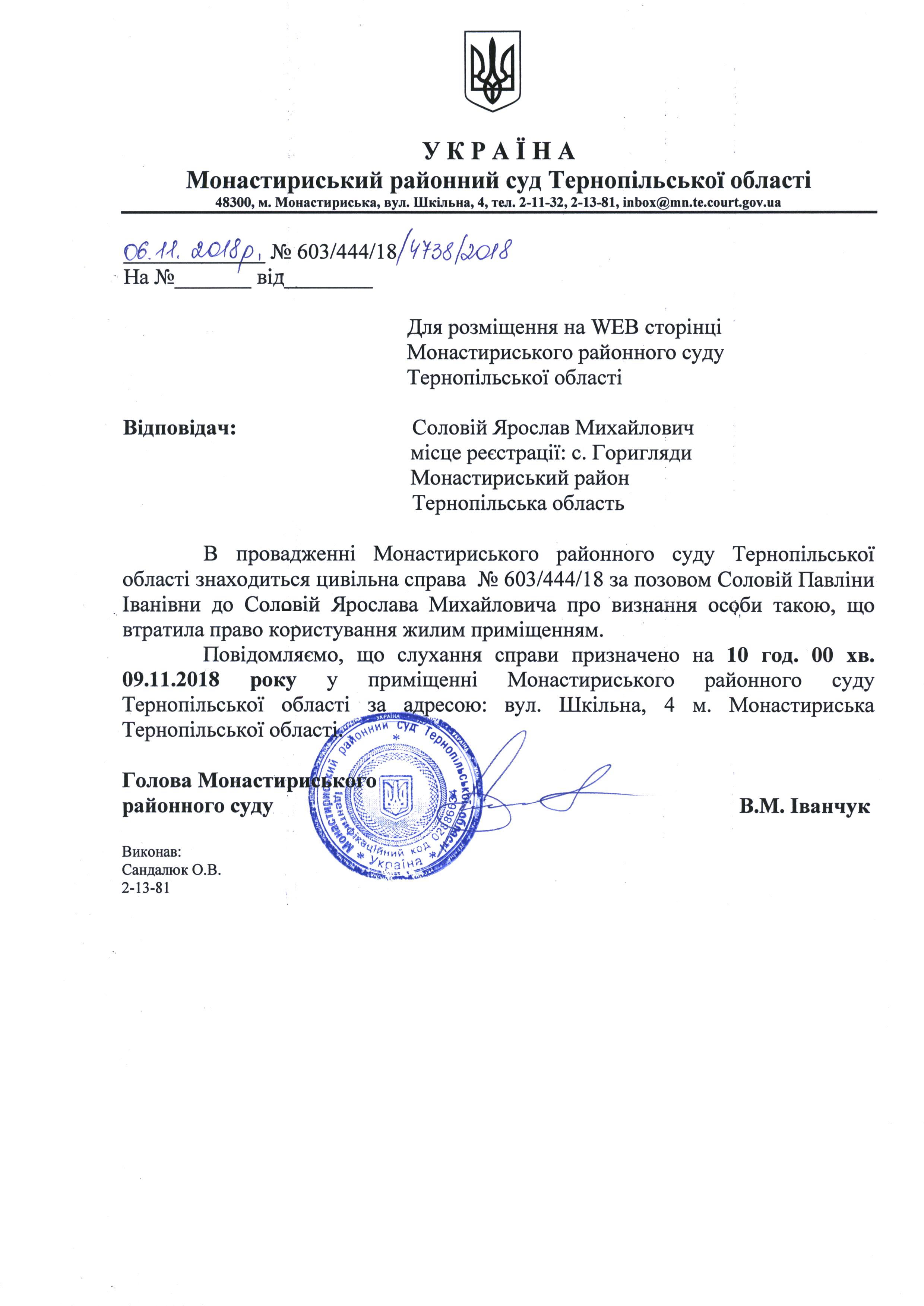 Оголошення про виклик до суду Соловій Ярослава Михайловича для розгляду справи на 10 год. 00 хв. 09.11.2018 року