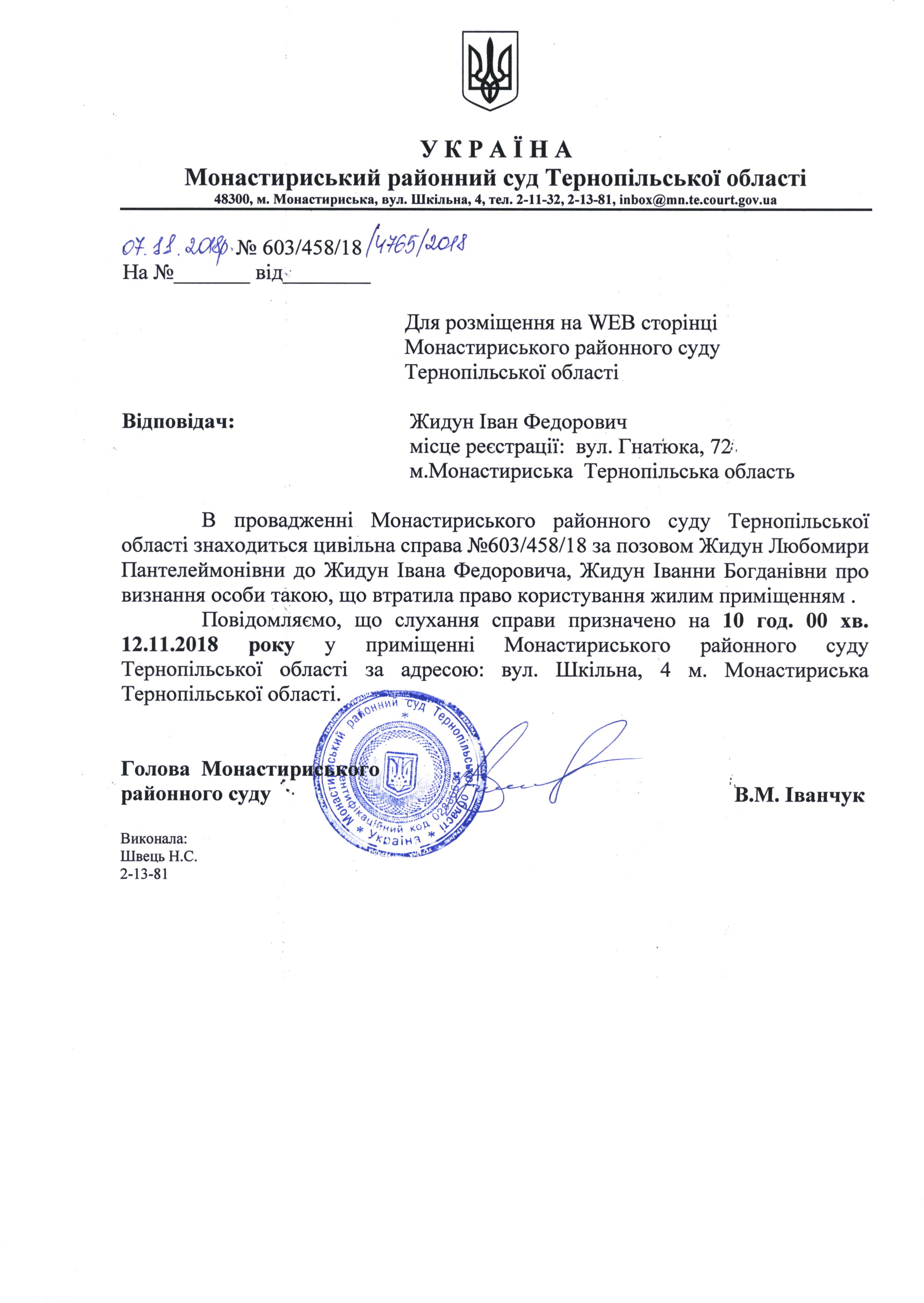 Оголошення про виклик до суду Жидун Івана Федоровича для розгляду справи на 10 год. 00 хв. 12.11.2018 року