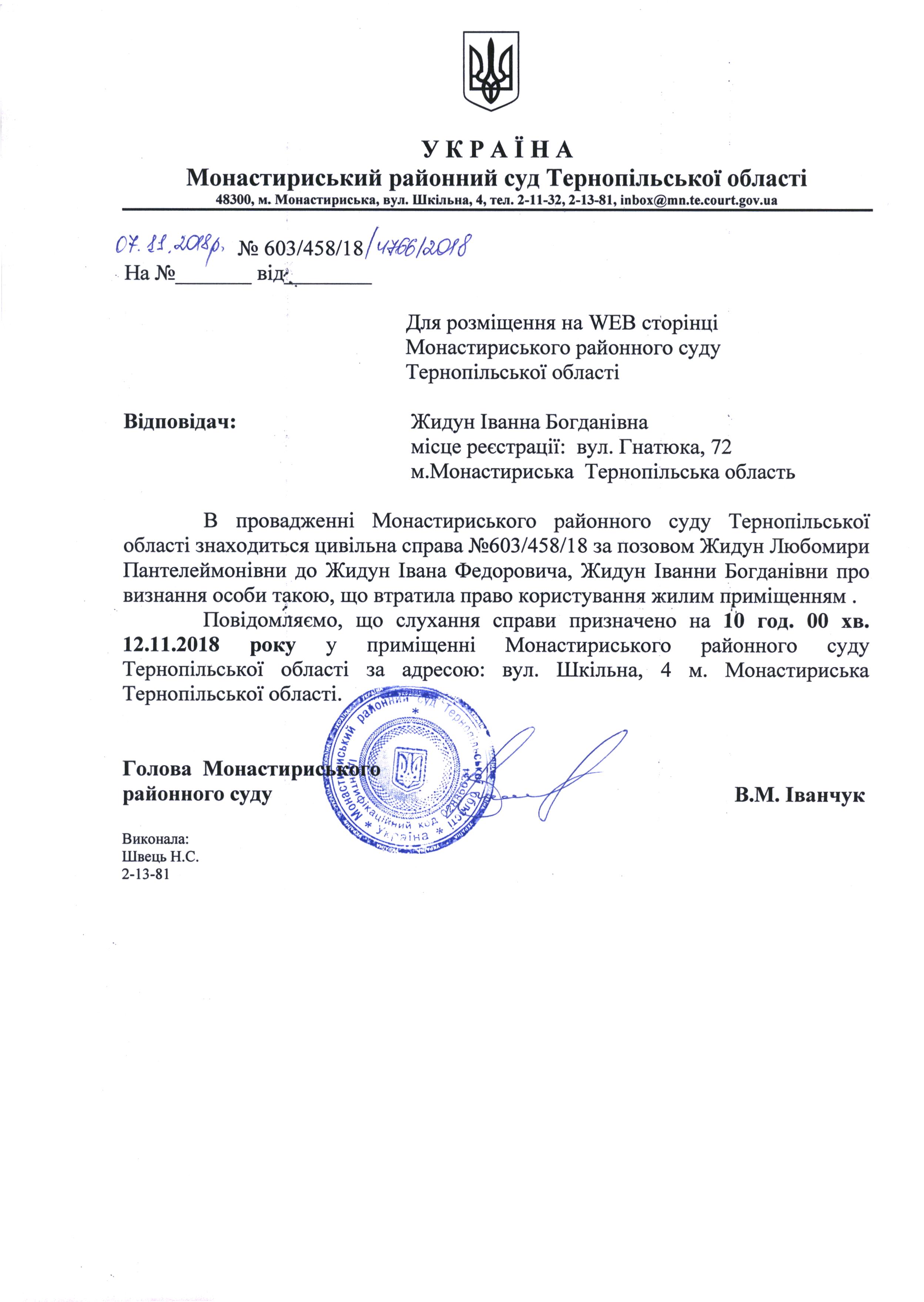 Оголошення про виклик до суду Жидун Іванни Богданівни для розгляду справи на 10 год. 00 хв. 12.11.2018 року