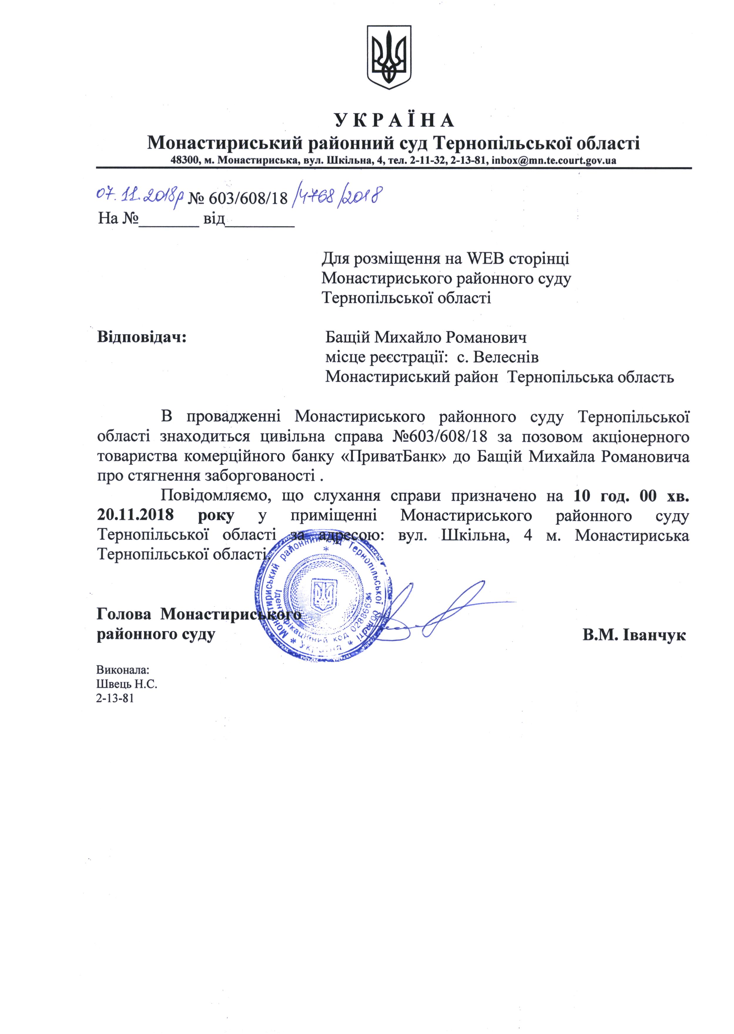 Оголошення про виклик до суду Бащій Михайла Романовича для розгляду справи на 10 год. 00 хв. 20.11.2018 року