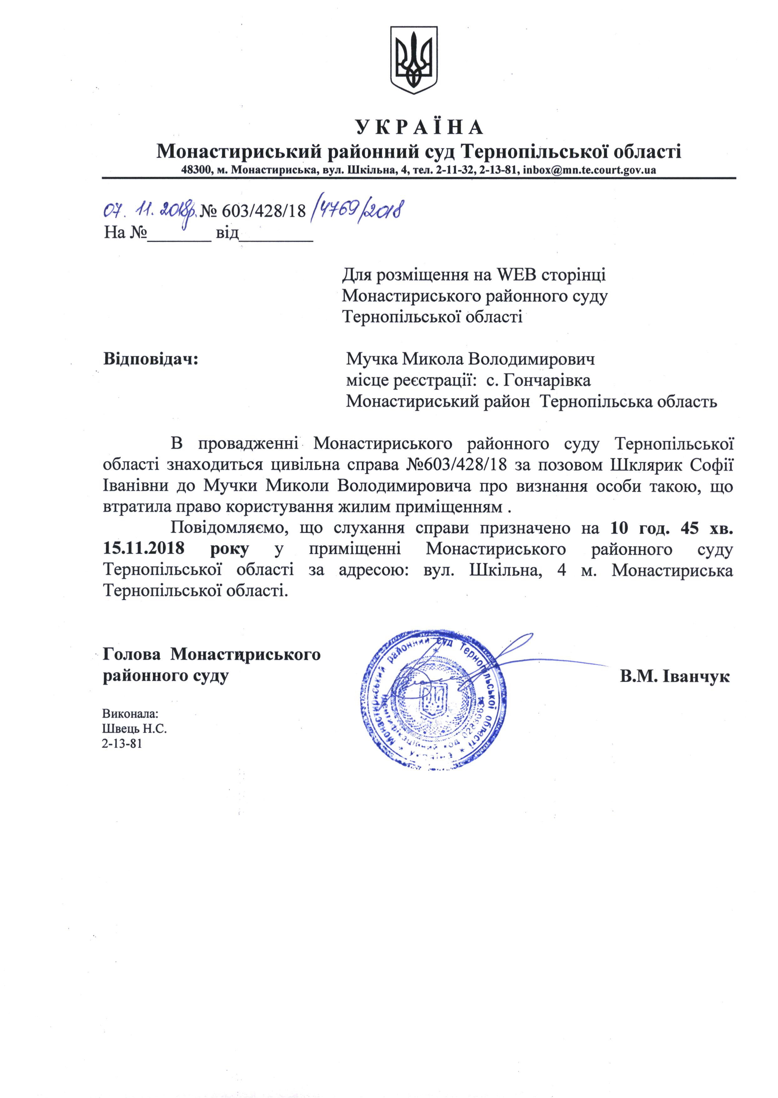 Оголошення про виклик до суду Мучки Миколи Володимировича для розгляду справи на 10 год. 45 хв. 15.11.2018 року
