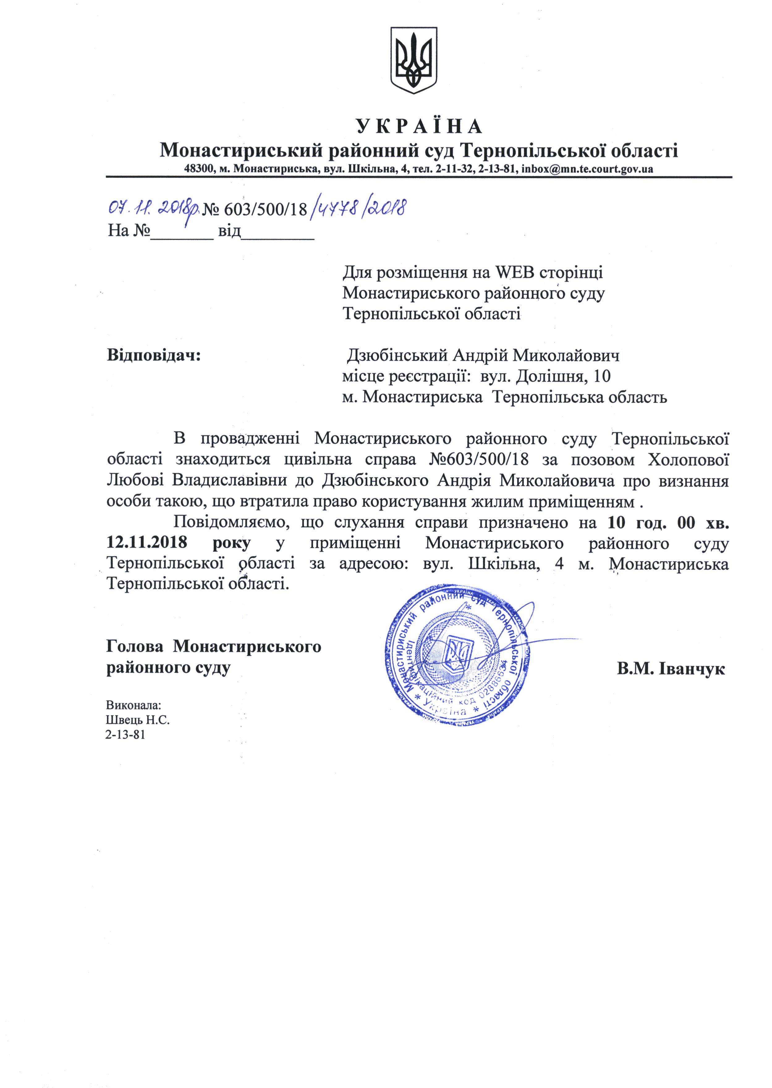 Оголошення про виклик до суду Дзюбінського Андрія Миколайовича для розгляду справи на 10 год. 00 хв. 12.11.2018 року