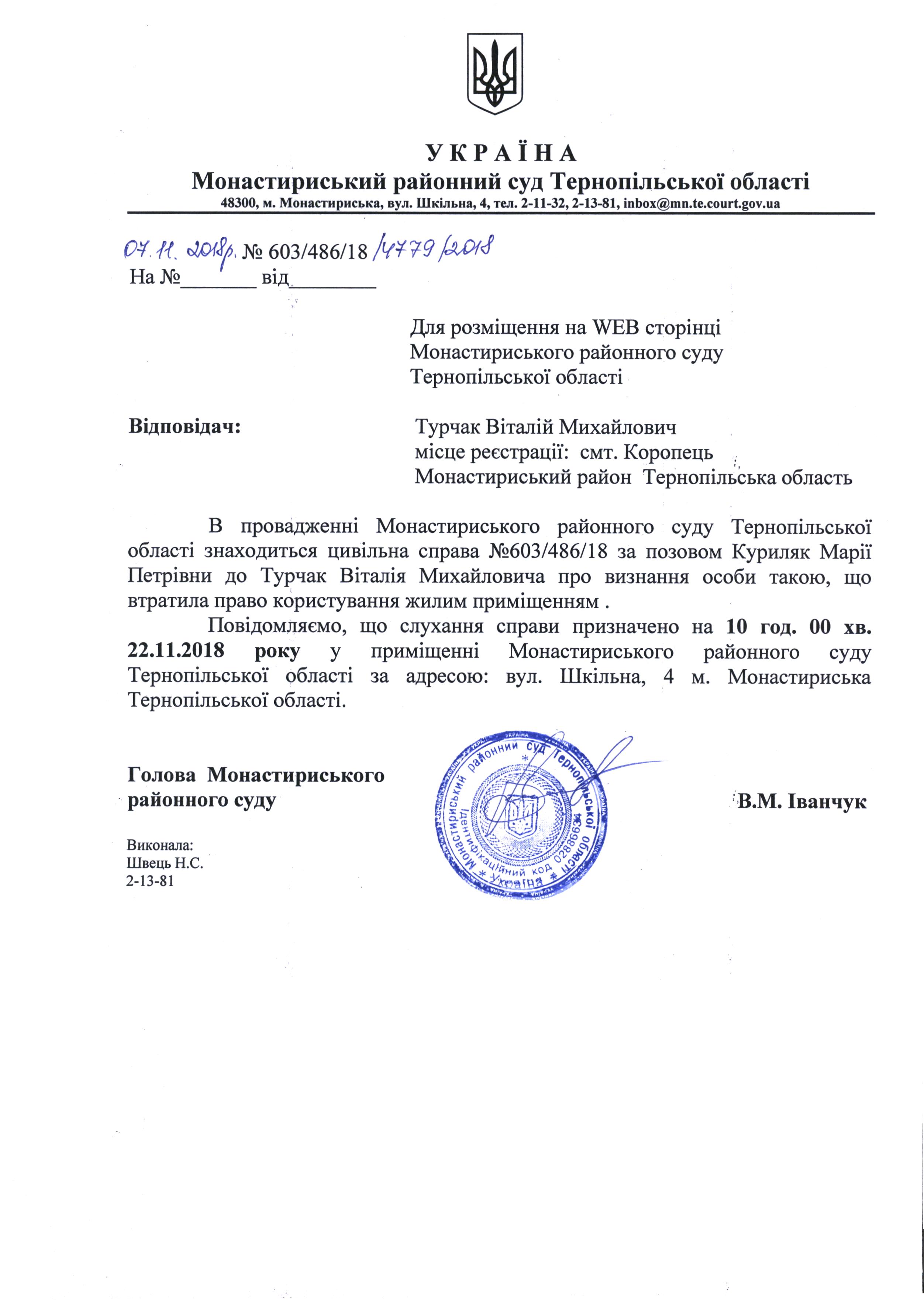 Оголошення про виклик до суду Турчак Віталія Михайловича для розгляду справи на 10 год. 00 хв. 22.11.2018 року