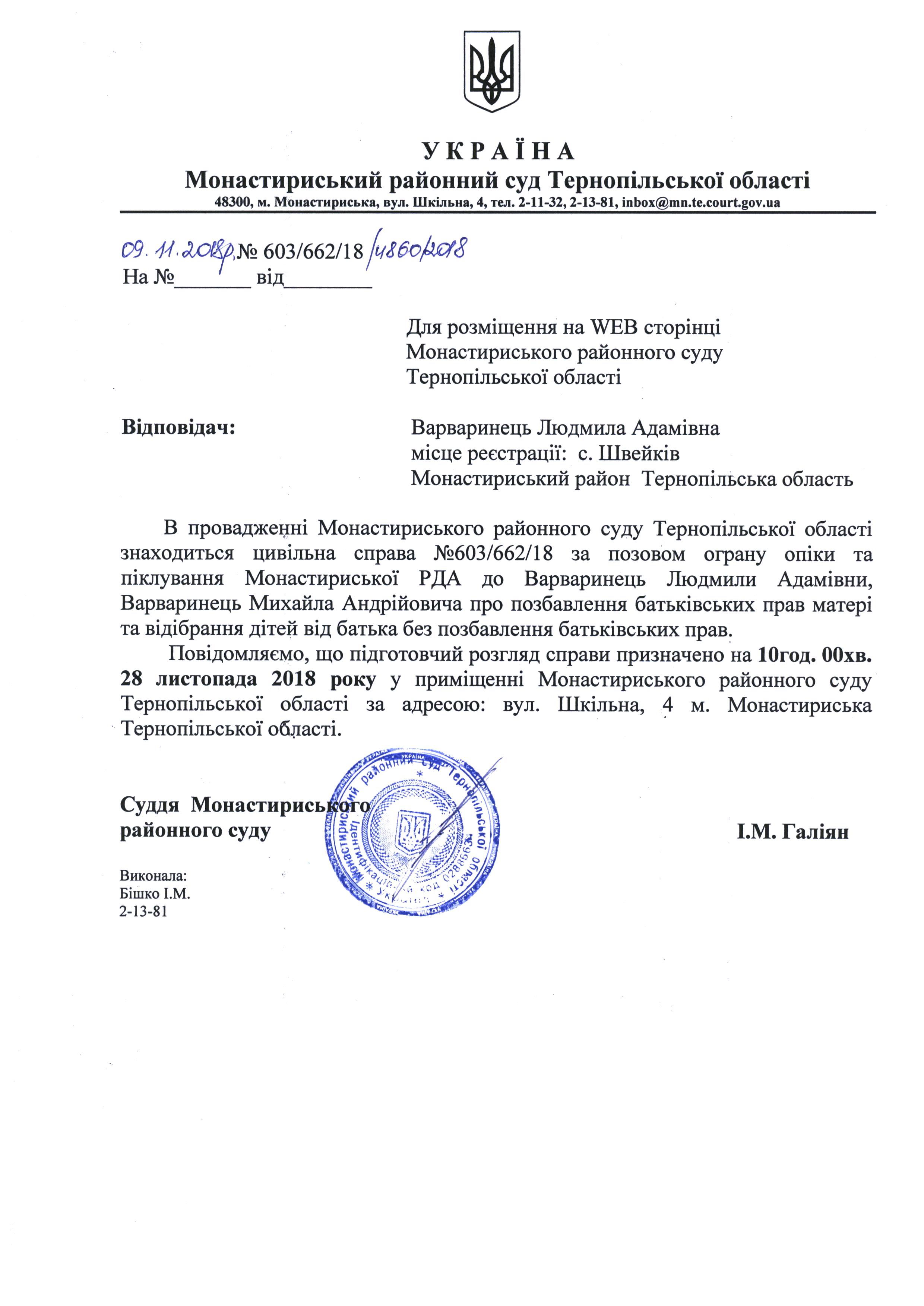 Оголошення про виклик до суду Варваринець Людмили Адамівни для розгляду справи на 10 год. 00 хв. 28.11.2018 року