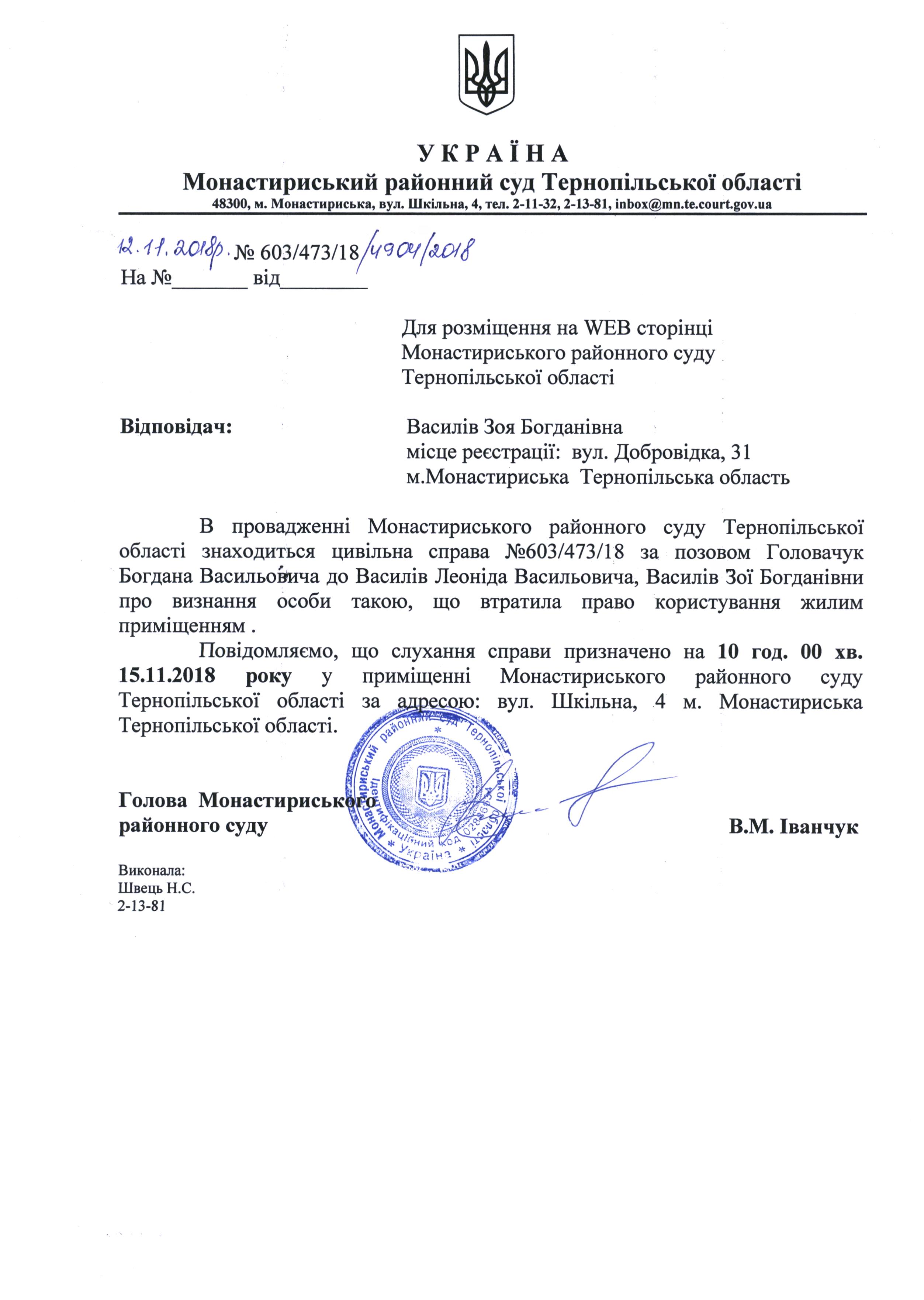 Оголошення про виклик до суду Василів Зої Богданівни для розгляду справи на 10 год. 00 хв. 15.11.2018 року
