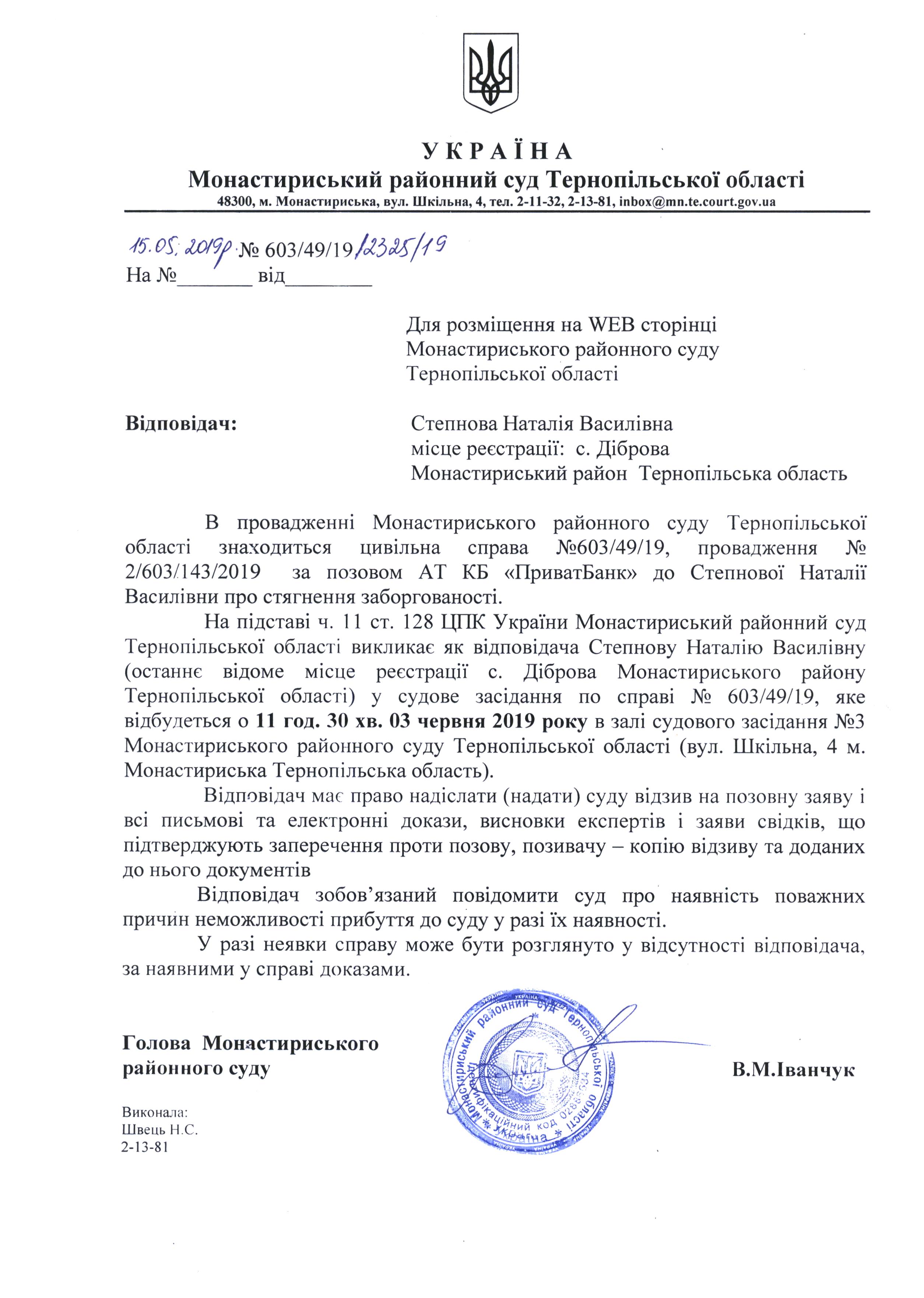Оголошення про виклик до суду Степнової Наталії Василівни для розгляду справи на 11 год. 30 хв. 03.06.2019 року