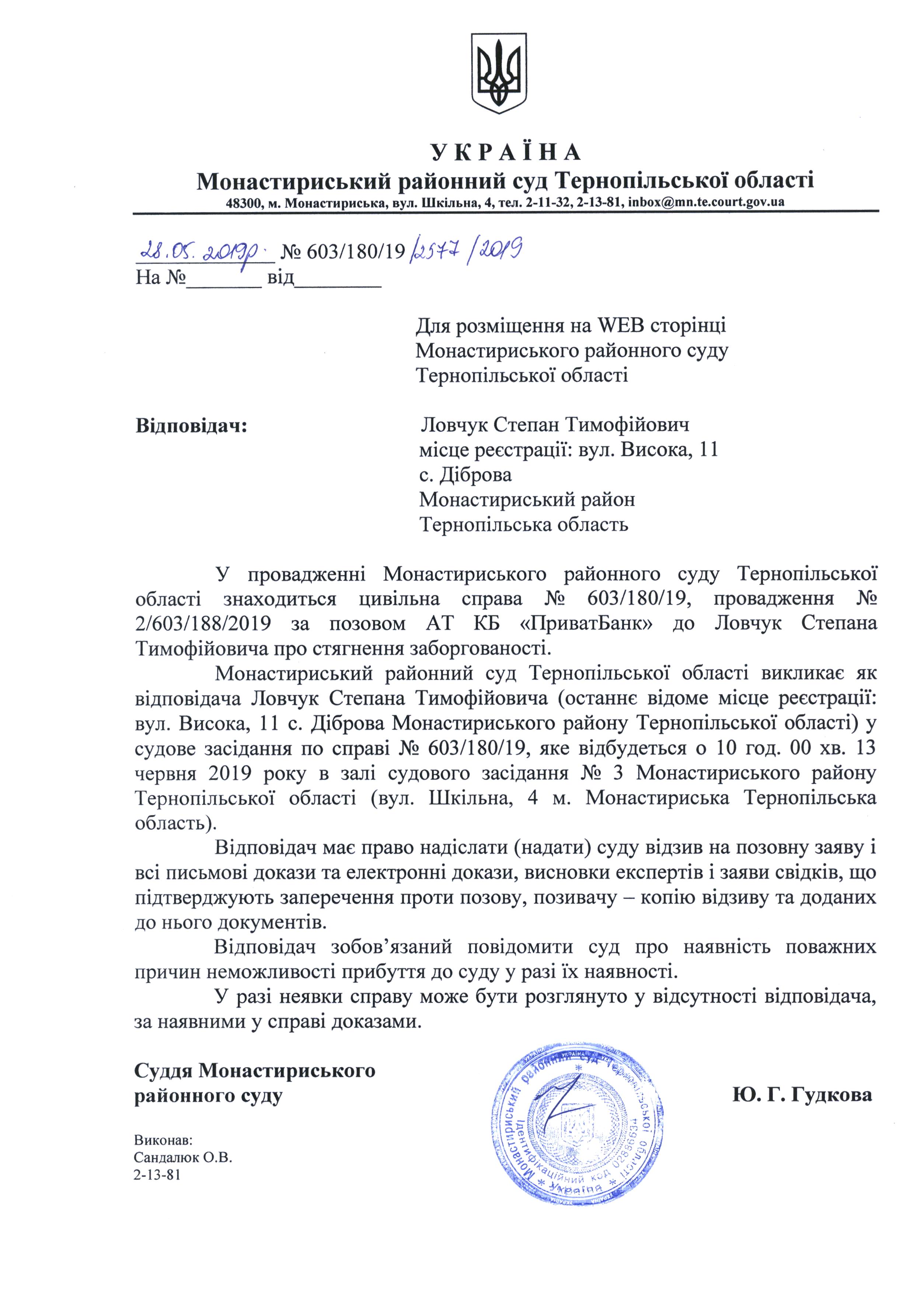 Оголошення про виклик до суду Ловчук Степана Тимофійовича для розгляду справи на 10 год. 00 хв. 13.06.2019 року