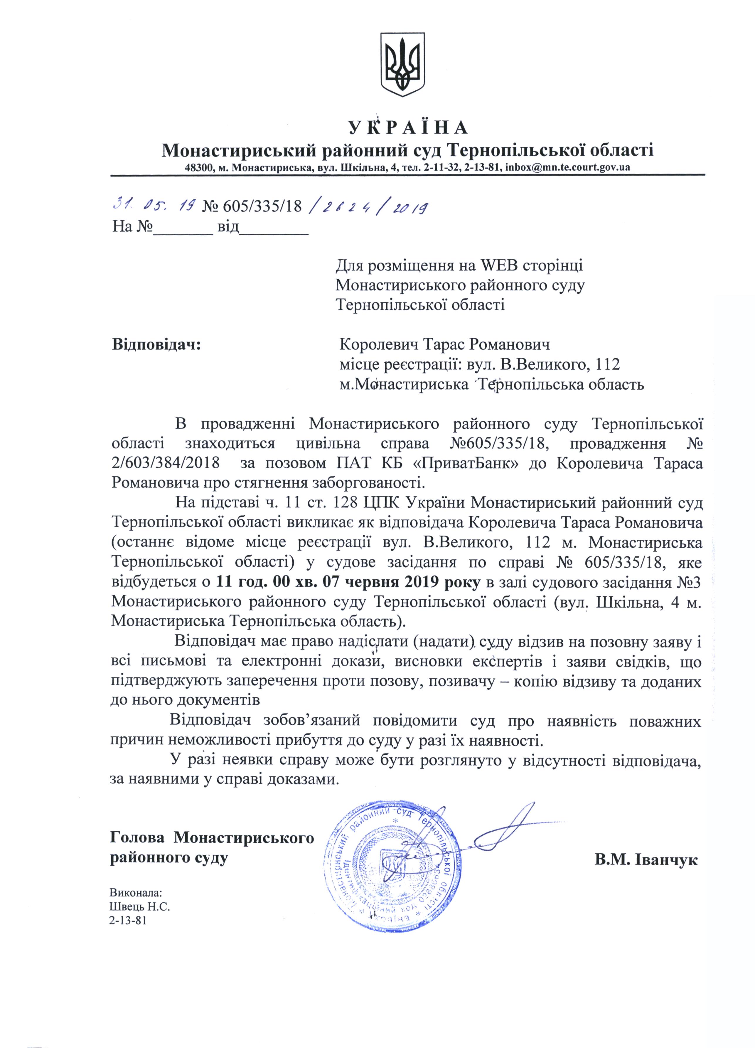 Оголошення про виклик до суду Королевича Тараса Романовича для розгляду справи на 11 год. 00 хв. 07.06.2019 року