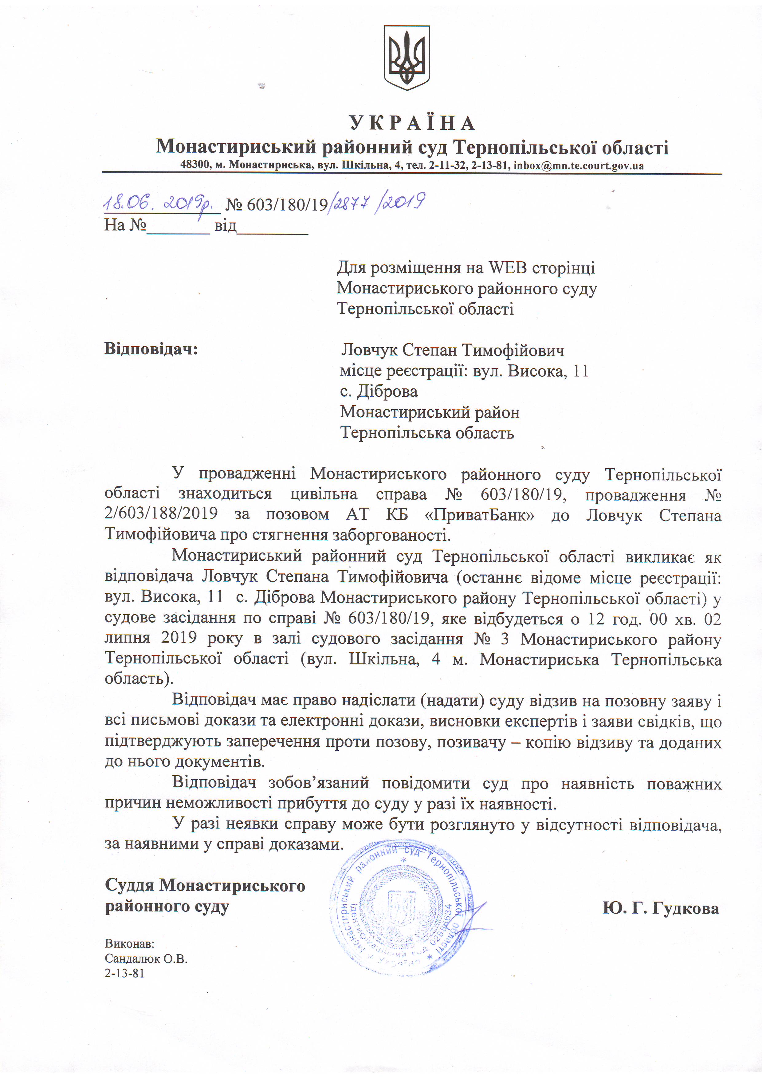Оголошення про виклик до суду Ловчук Степана Тимофійовича для розгляду справи на 12 год. 00 хв. 02.07.2019 року
