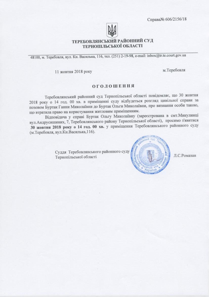 Суд викликає Буртак Ольгу Миколаївну
