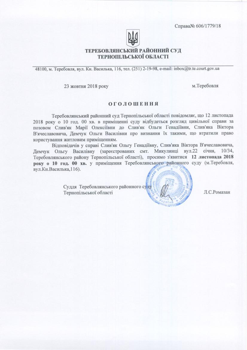 Суд викликає Слив'як О.Г. Слив'яка В.В. Демчук О.В.