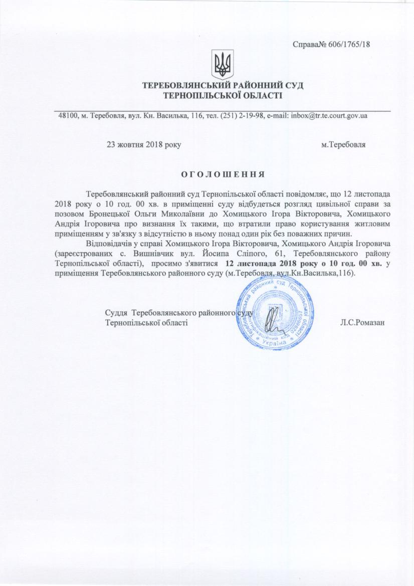Суд викликає Хомицького І.В. Хомицького А.І.