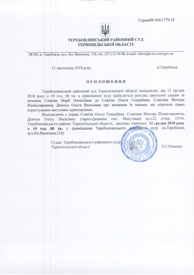 Суд викликає Слив'як О.Г. Слив'яка В.В. Демчук О.В.