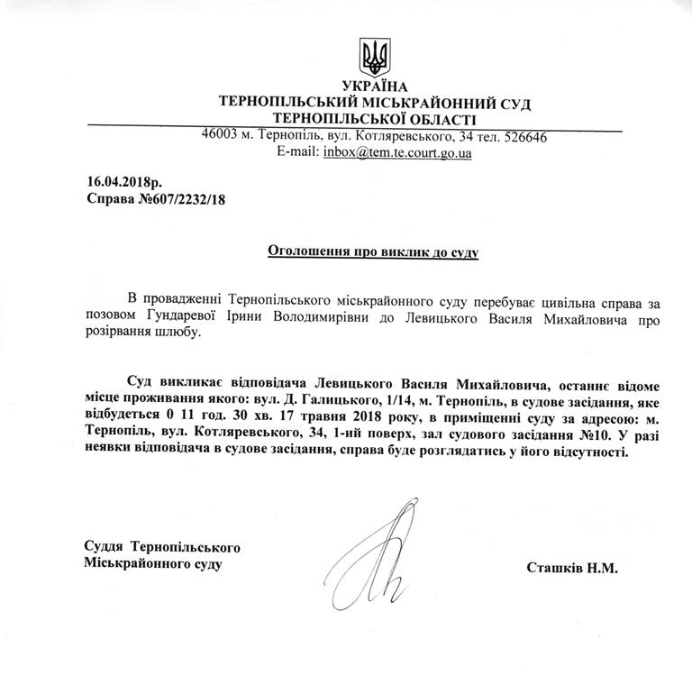 Суд викликає Левицького Василя Михайловича