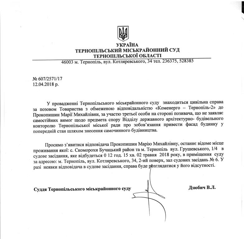 Суд викликає Прокопишин Марію Михайлівну