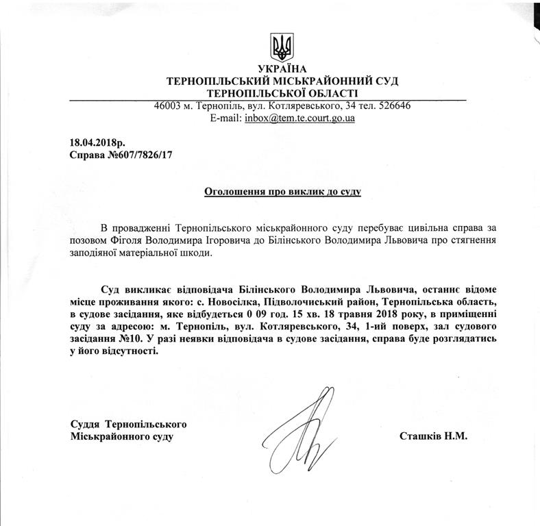 Суд викликає Білінського Володимира Львовича