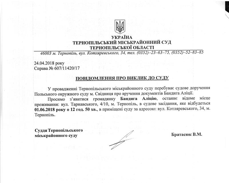 Суд викликає Бандига Аліцію