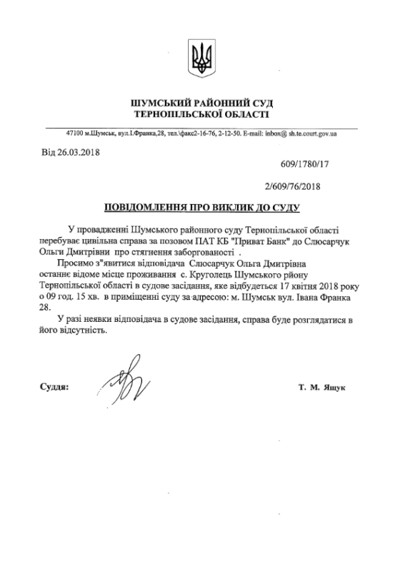 Суд викликає Слюсарчук Ольгу Дмитрівну на 17 квітня 2018 року на 09 год. 15 хв.