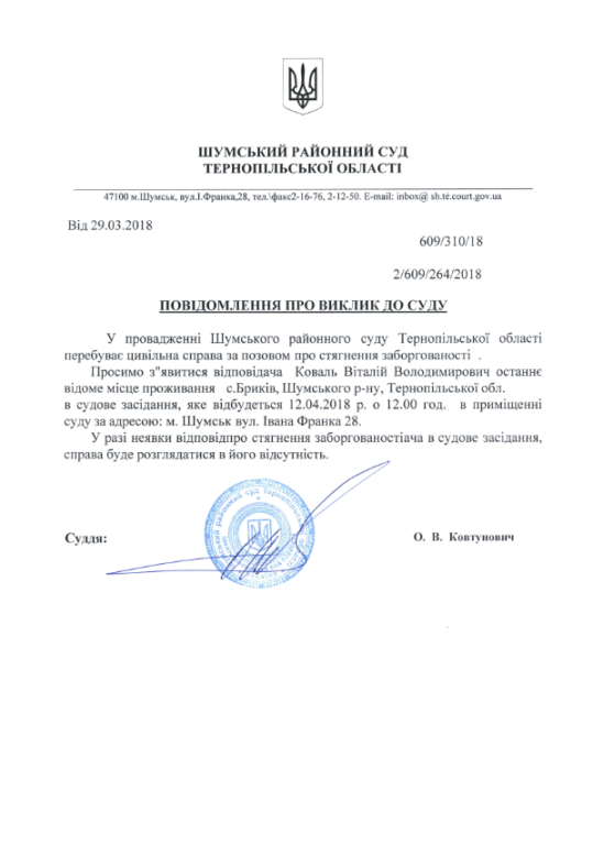 Суд викликає Коваль Віталія Володимировича на 12 квітня 2018 року на 12:00 год.