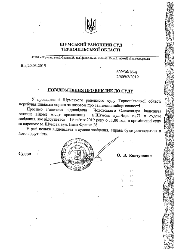 Суд викликає Чоловського Олександра Івановича на 19 квітня 2019 року на 11:00 годин