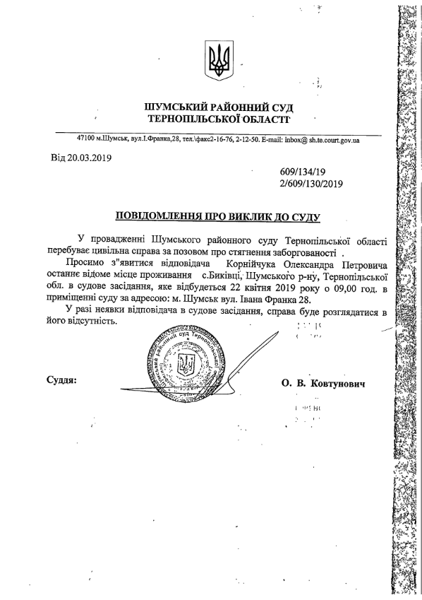 Суд викликає Корнійчука Олександра Петровича на 22 квітня 2109 року на 09:00 годин