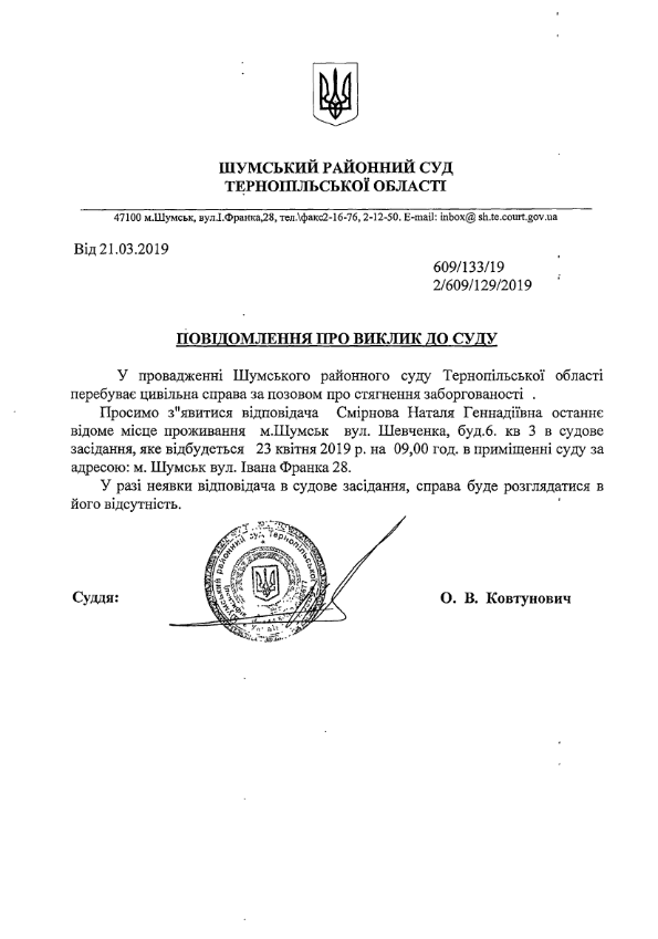 Суд викликає Смірнову Наталію Геннадіївну на 23 квітня 2019 року на 09:00 годин
