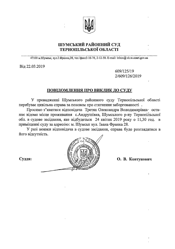Суд викликає Третяк Олександра Володимировича на 24 квітня 2019 року на 11 годин 30 хвилин