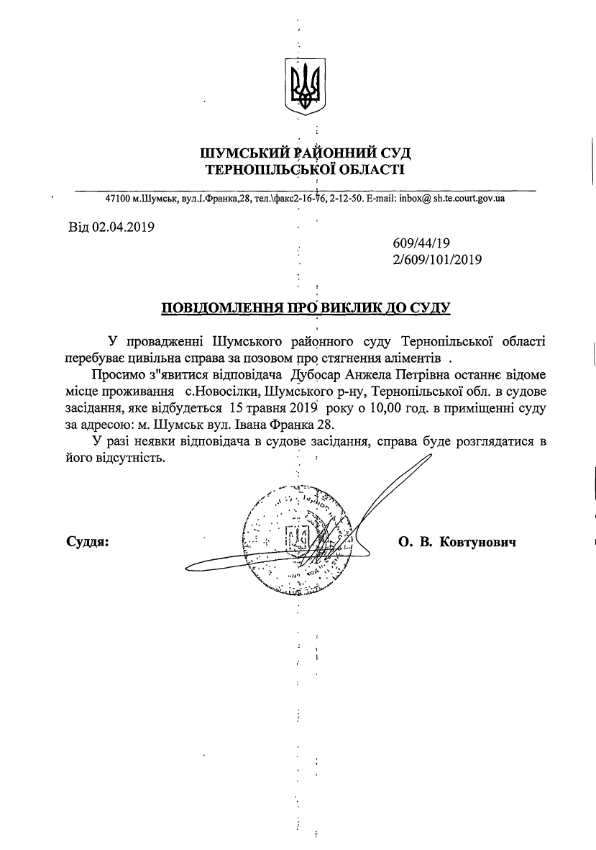Суд викликає Дубосар Анжелу Петрівну на 15 травня 2019 року на 10:00 годин