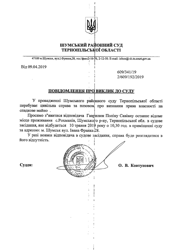 Суд викликає Гаврилюк Поліну Савівну на 10 травня 2019 року на 10 годину 30 хвилин