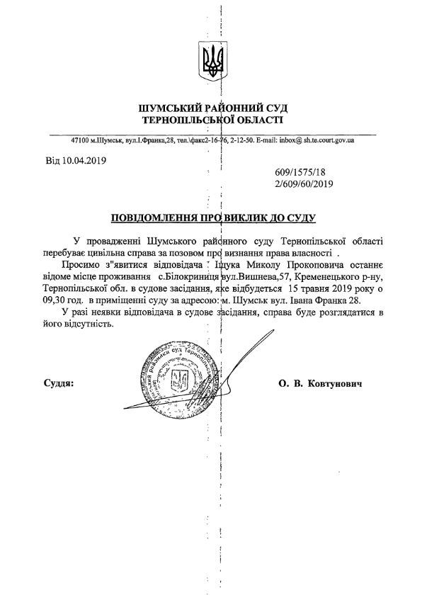 Суд викликає Іщука Миколу Прокоповича на 15 травня 2019 року на 09 годин 30 хвилин