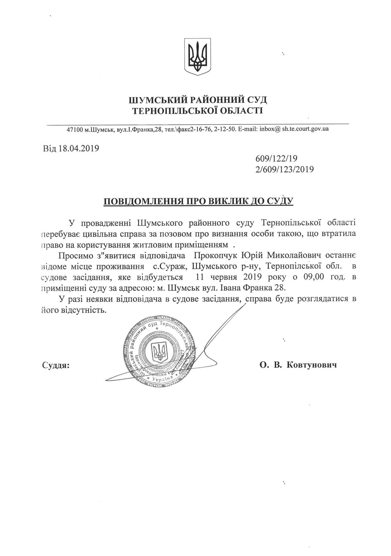 Суд викликає Прокопчука Юрія Миколайовича на 11.06.2019 року на 09-00 годин