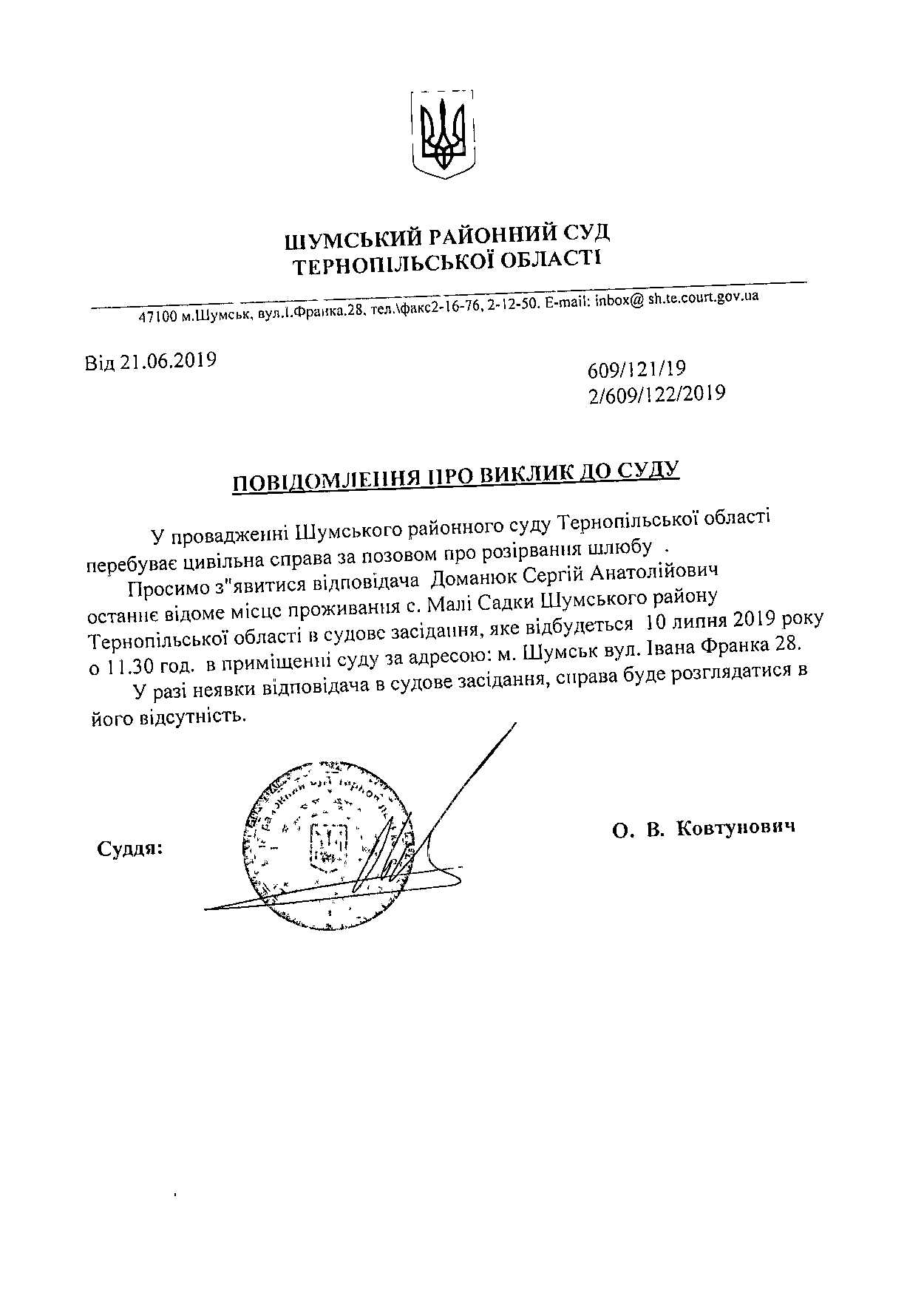 Суд викликає Доманюка Сергія Анатолійовича на 10 липня 2019 року на 11 годину 30 хвилин