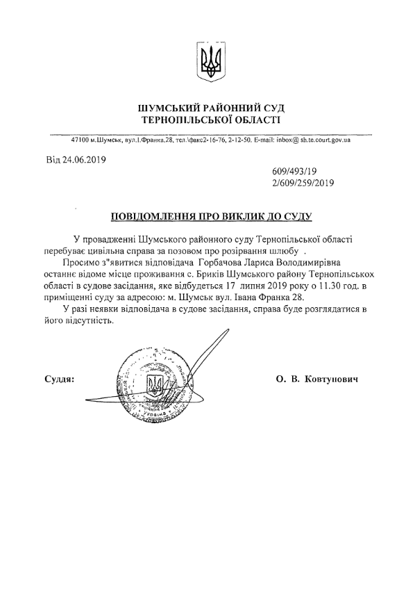 Суд викликає Горбачову Ларису Володимирівну на 17 липня 2019 року на 11 годин 30 хвилин